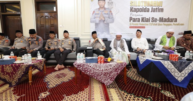 BANGKALAN - Kapolda Jawa Timur Irjen Pol. Drs. Nanang Avianto, M.Si., didampingi para pejabat utama Polda Jatim dan Kapolres Bangkalan AKBP Hendro Sukmono serta Kapolres Sampang Hartono, melaksanakan silaturahmi dengan para kiai, alim ulama, habaib, dan pimpinan pondok pesantren se-Madura di Pondok Pesantren Sembilangan, Bangkalan. Kamis, (6/11/2025).